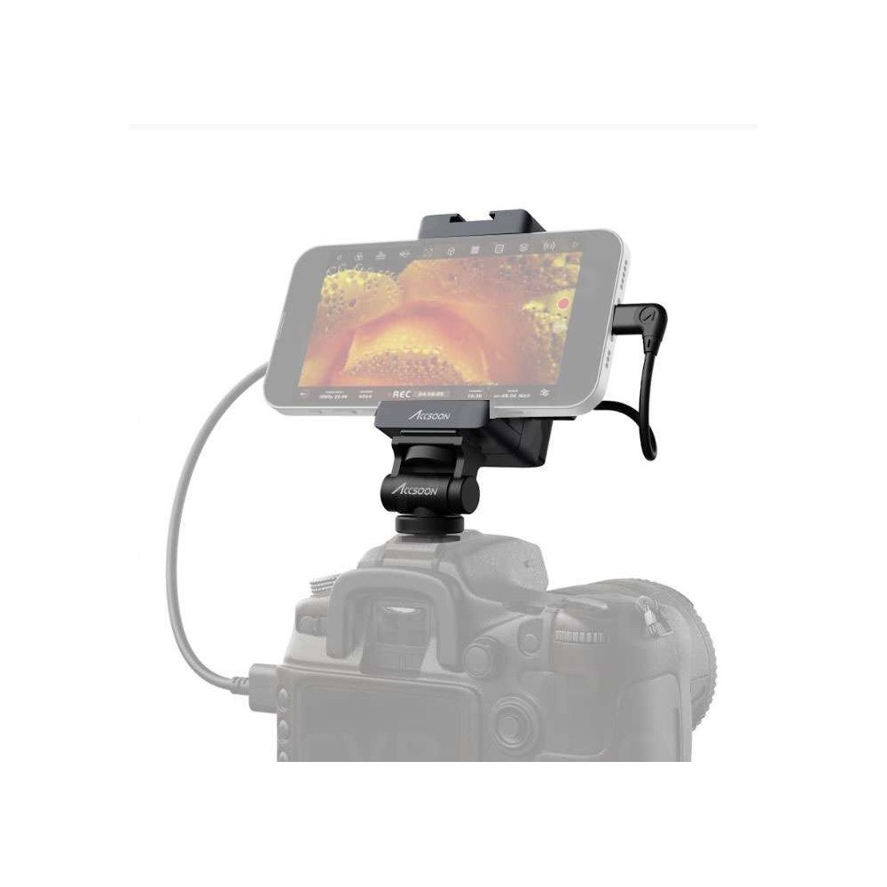 Snap your iPhone into the SeeMo and it is transformed in seconds - there’s no need to carry around an extra monitor any more. The SeeMo is a small box measuring 50mm x 39mm x 80mm that’s attached via a built-in clamp which accommodates all recent iPhones. Connect your iPhone to SeeMo using the included right angle Lightning to USB-C cable, and your camera to SeeMo using a HDMI cable. It’s that straightforward.